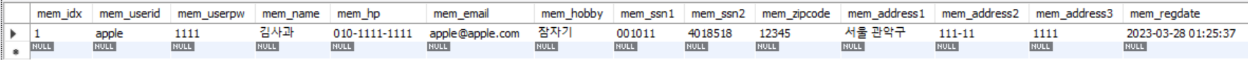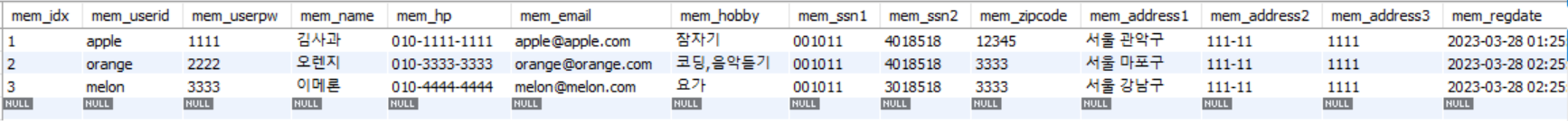 mem_hobby, mem_ssn1, mem_ssn2, mem_zipcode, mem_address1, mem_address2, mem_address3)
