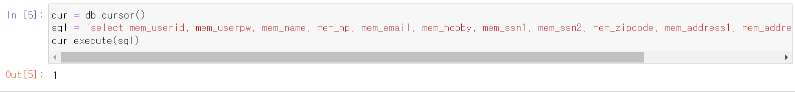 sql = 'select mem_userid, mem_userpw, mem_name, mem_hp, mem_email, mem_hobby, mem_ssn1, mem_ssn2, mem_zipcode, mem_address1, mem_address2, mem_address3 from member2'
