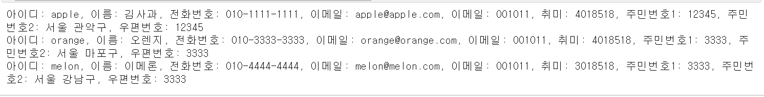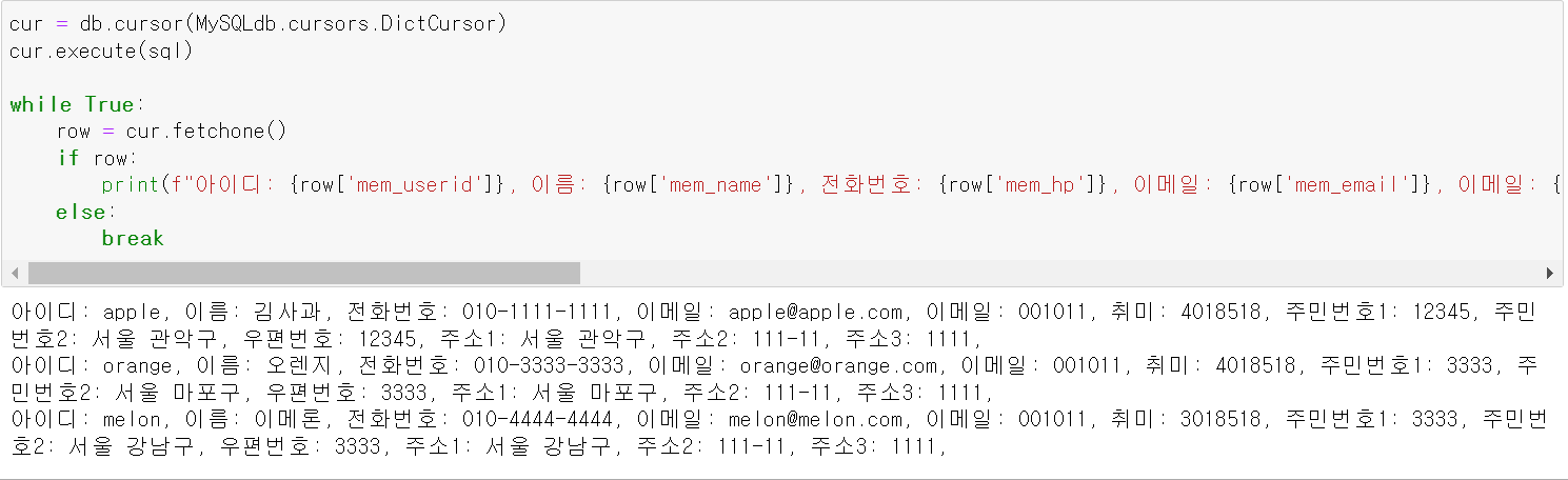 print(f"아이디: {row['mem_userid']}, 이름: {row['mem_name']}, 전화번호: {row['mem_hp']}, 이메일: {row['mem_email']}, 이메일: {row['mem_ssn1']}, 취미: {row['mem_ssn2']}, 주민번호1: {row['mem_zipcode']}, 주민번호2: {row['mem_address1']}, 우편번호: {row['mem_zipcode']}, 주소1: {row['mem_address1']}, 주소2: {row['mem_address2']}, 주소3: {row['mem_address3']},")