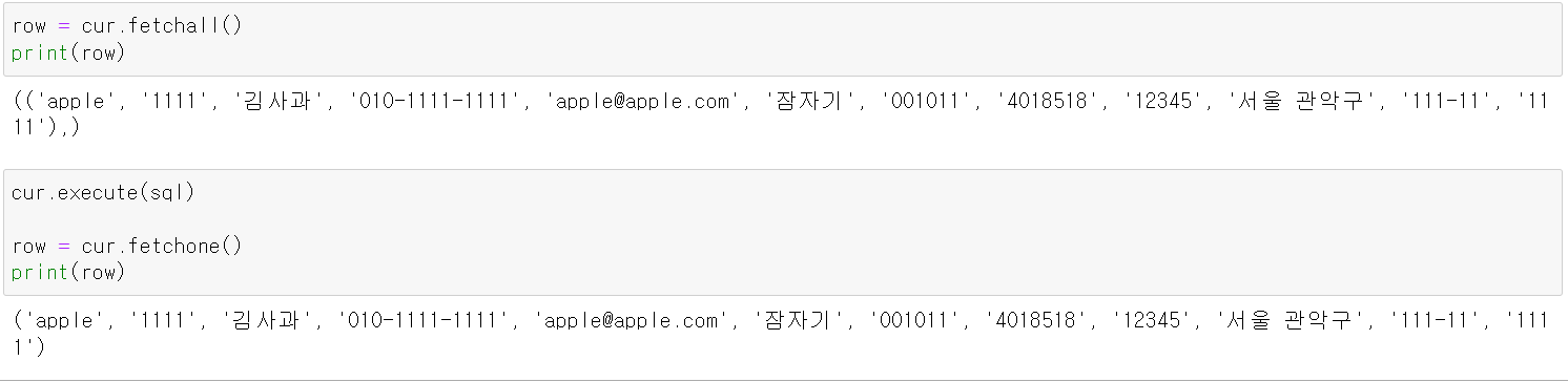 * fetchone(): 한번에 하나의 tuple을 가져옴. 다시 메서드를 호출하면 다음 데이터 하나를 가져옴