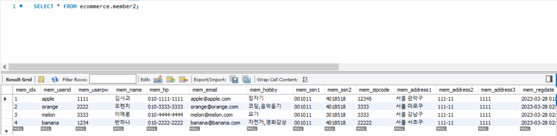 데이터를 삽입하고 난 후 다시 SELECT * FROM ecommerce.member2; 하면 4개로 변한걸 볼 수 있다.