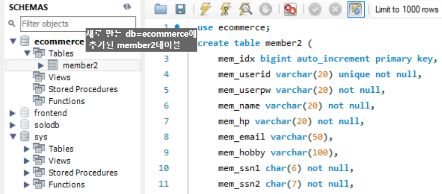 SELECT * FROM ecommerce.member2;를 하고 원래 들어 있는 3개 확인.