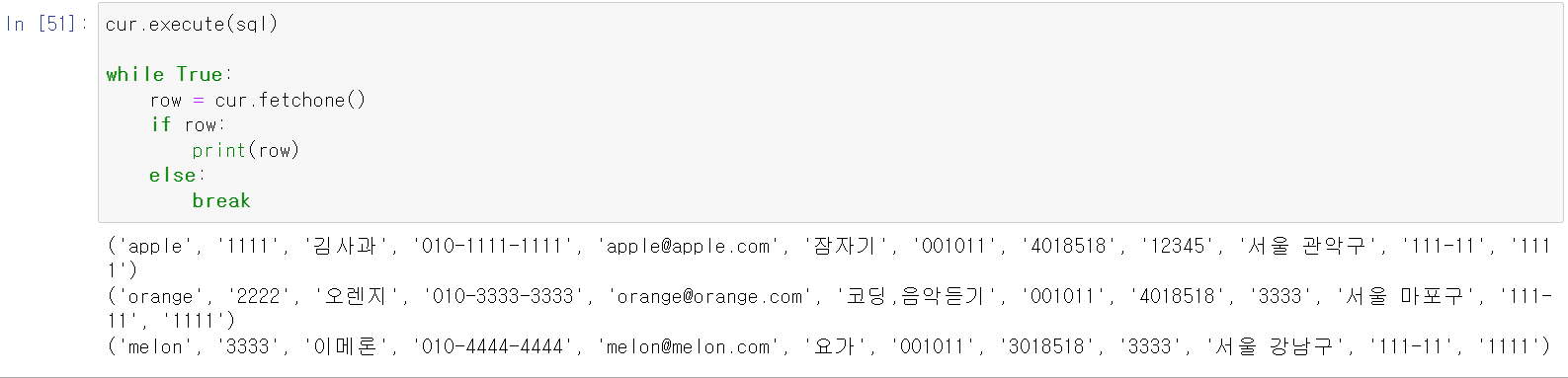 fetchone()을 이용하여 루프를 돌면서 모든 데이터를 출력하기
