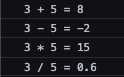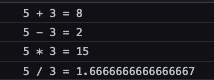 console.log(`${num1} / ${num2} = ${num1 / num2}`);