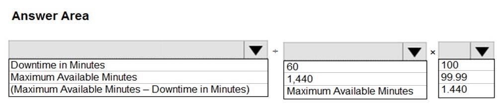 가용 영역의 가상 머신에 대한 "월간 가동 시간 백분율"은 주어진 Microsoft Azure 구독에 대한 청구 월의 최대 가용 시간에서 다운 타임을 뺀 최대 가용 시간 (분)으로 계산됩니다. 월간 가동률은 다음 공식으로 표시됩니다.
