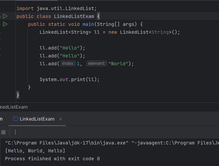 LinkedList의 값을 추가하기 위해서는 add() 메서드를 사용하며, add(Object) : 기본적으로 add를 사용하여 추가하면 LinkedList의 마지막에 데이터를 추가하는 방법과, add(int Index, Object) : LinkedList의 Index에 데이터를 추가하는 방법이 있습니다.