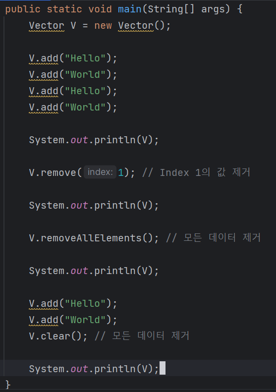 만약 값을 한꺼번에 삭제하려면 removeAllElements(), clear() 메서드를 사용하여 삭제할 수 있습니다.