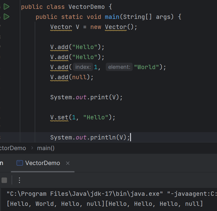 Vector의 값을 추가하기 위해서는 add()메서드를 사용하고, 값을 변경하려면 set()메소드를 사용합니다.