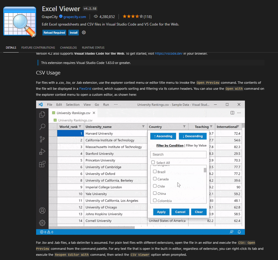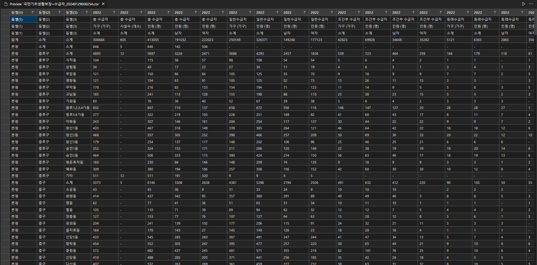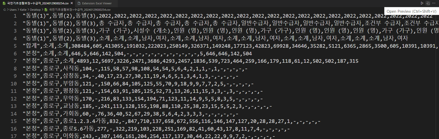 우선 엑셀이나 csv파일은 비쥬얼 스튜디오 코드에서 열면 인코딩이 안 되었다고 나오거나 이렇게 경계없이 나와버린다.