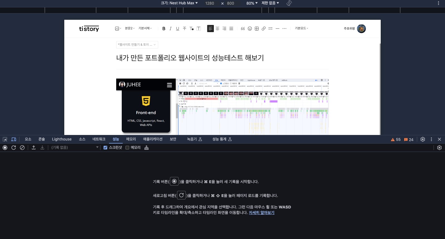 여기까지 만들어본 내 웹사이트의 성능이 어떤지 이것저것 눌러보고 이동도 해본 결과 다행히 빨간색은 안 뜬다!!!