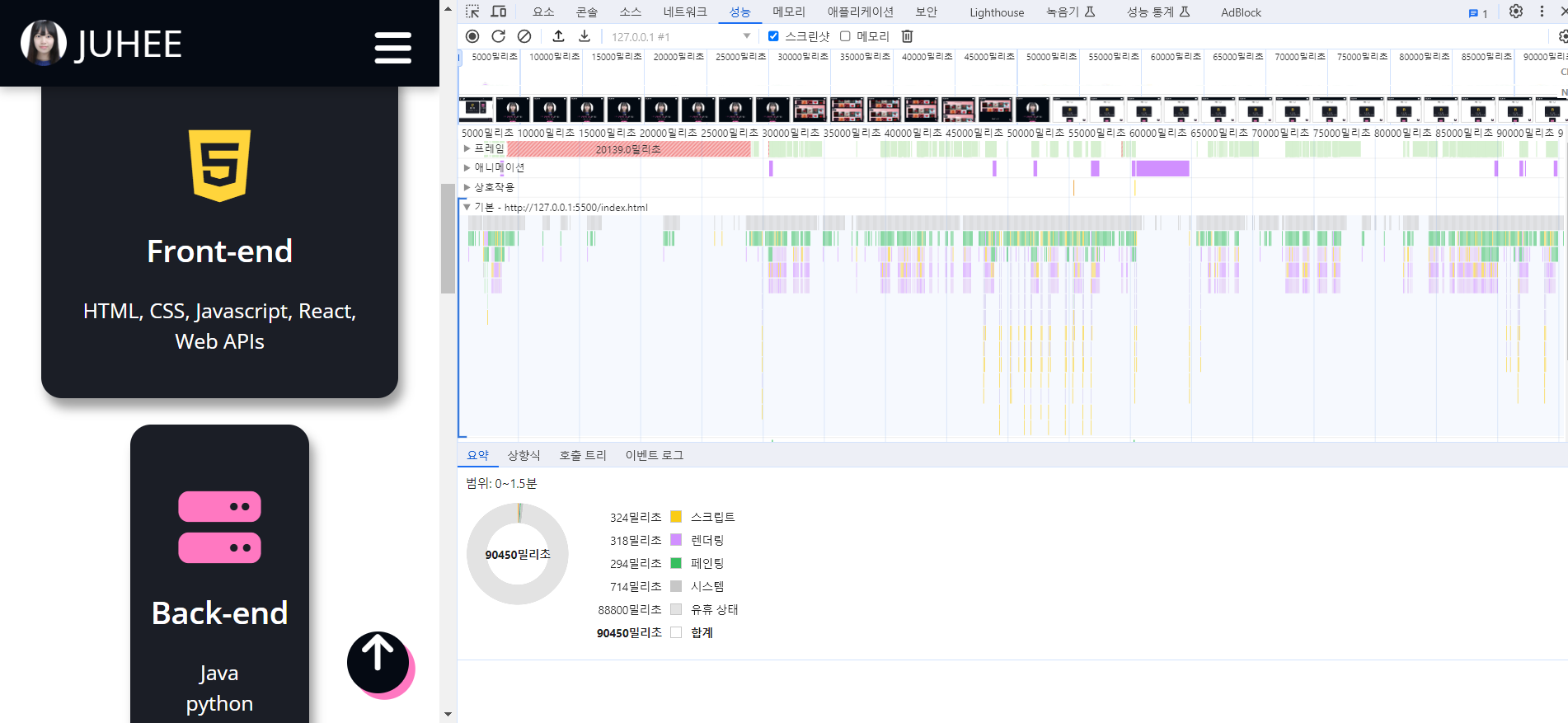개발자 도구를 누르고 기록 버튼을 누르자~버튼, 메뉴, 하나 하나 다 눌러보고 페이지 잘 넘어가는지 확인하고 기록 중지 누르고 기다리면 아래와 같은 화면이 뜬다.