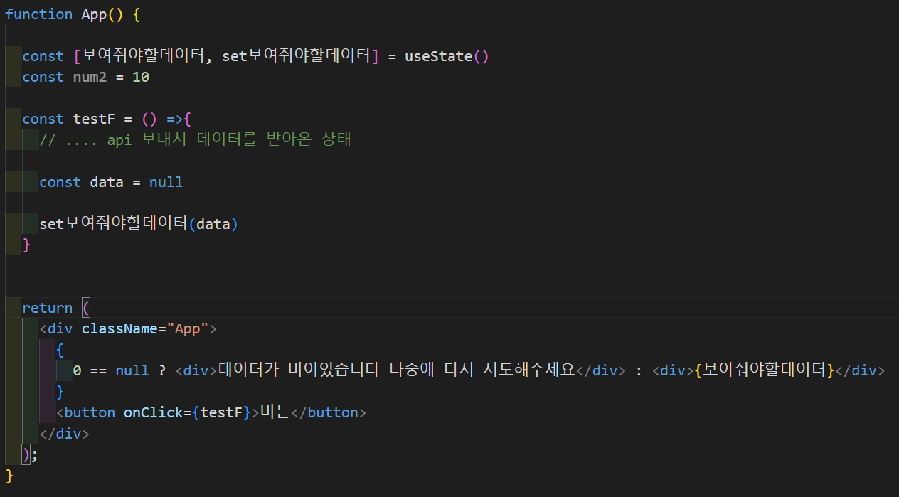 API를 받아서 쓸 때 데이터에 값이 있는 것과 값이 없는것이 있는데 null이었을 떄 사용자에게 어떤 화면을 보여주는지 삼합연산자를 사용해서 화면에 보여 준다고 한다. 삼합연산자 안에 <div></div>텍스트를 넣는건 처음에 당연히 쓸 수 있다고 생각했는데 같이 프론트앤드 공부 하시는 분이 이건 신기하다고해서 흥미로웠다.