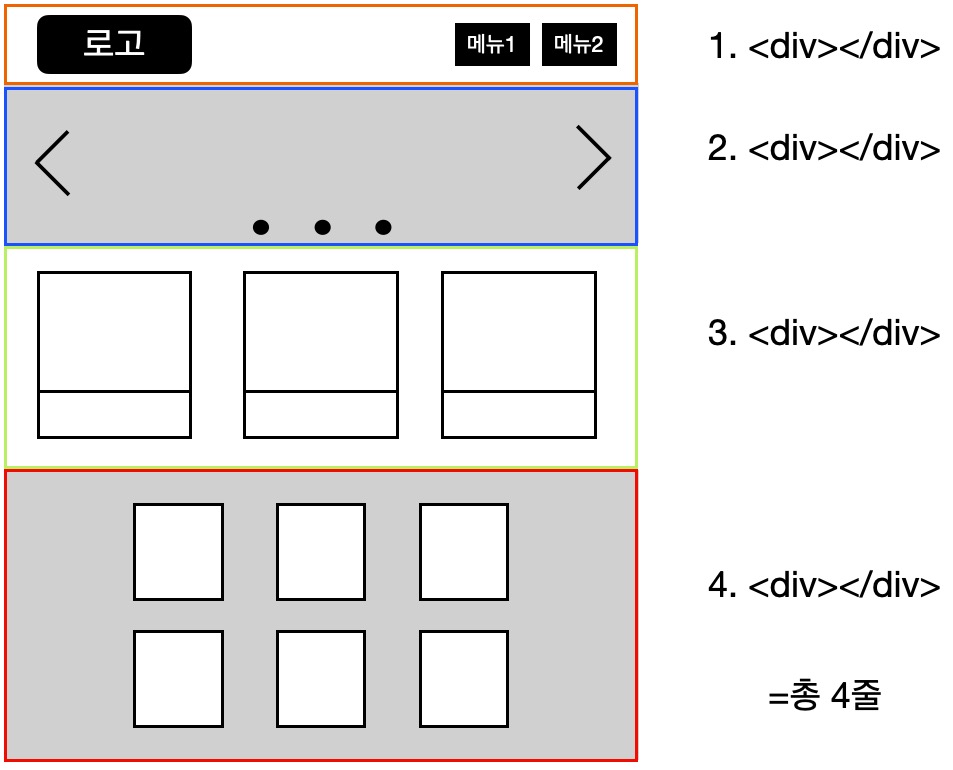 HTML의 레이아웃을 잡기 위해서 가로로 한줄한줄 나눠가면서 레이아웃을 쪼개야 합니다.