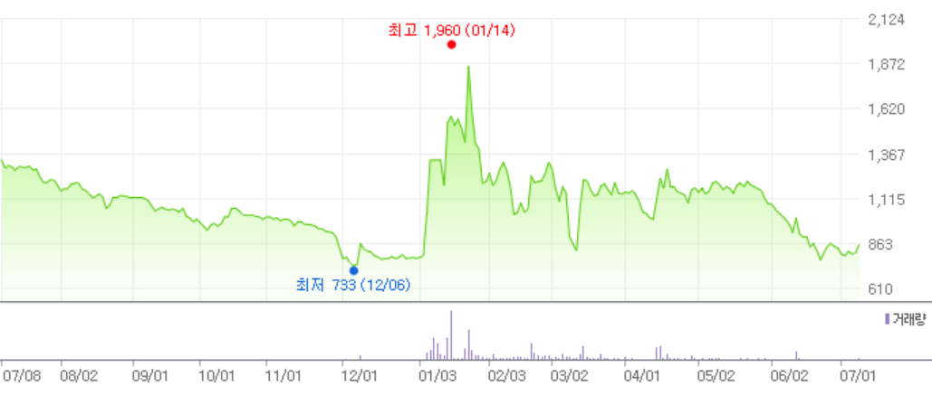 최고가가 1960, 최저가가 733 이 중간 가격이 1200원 언저리라면 매수해도 좋은 가격대이구요.