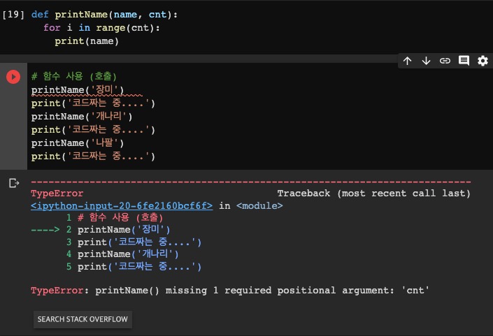 def printName(name) :   소괄호 안에 name변수를 넣어주고, print(name)   name이라는 변수의 값을 출력해줘라고 하면 그 결과는 에러가 뜬다.  printName() missing 1 required positional argument: 'name' name이라는 인자가 없다라는 뜻인데