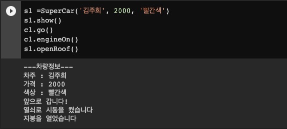 상속을 했으니 Car( )객체는 없어지고 SuperCar( )객체가 새로 생김. 실행해보면 잘 출력 되는걸볼 수 있다.