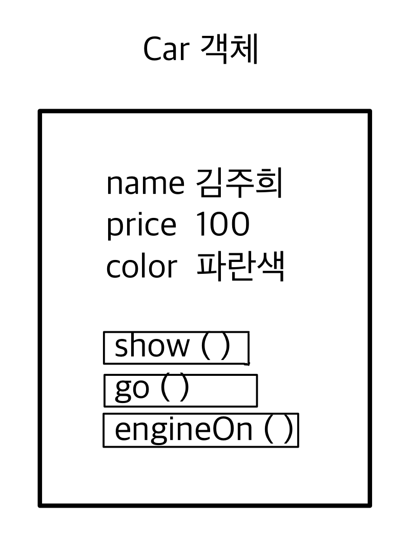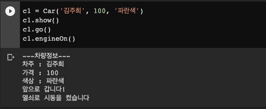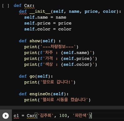 Car클래스 객체가 하나 만들어지고 클래스 객체 안에 인스턴스 변수 name, price, color가 만들어진 상태에서 c1 = Car('김주희', 100, '파란색')를 실행해주니 각각 name 김주희, price 100, color 파란색 값이 들어가 있는다.