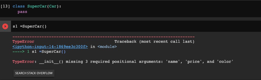 Car( )클래스를 상속받은 SuperCar( )클래스를 생상자를 실행시키고 SuperCar( )을 불러오는데 에러가 생긴다. name, price, color에 들어갈 값이 필요하다는 뜻. (앞에 만든 클래스에 보내줄 값이 필요하니 값을 입력해 달라는 의미)