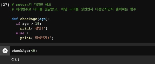 매개변수로 나이를 입력 받고 , 해당 나이를 성인인지 미성년자인지 출력하는 함수이다.