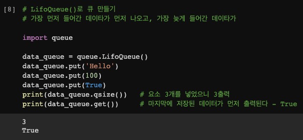 LifoQueue( ) : 나중에 입력된 데이터가 먼저 출력되는 구조의 큐 자료구조를 생성(스택구조와비슷)