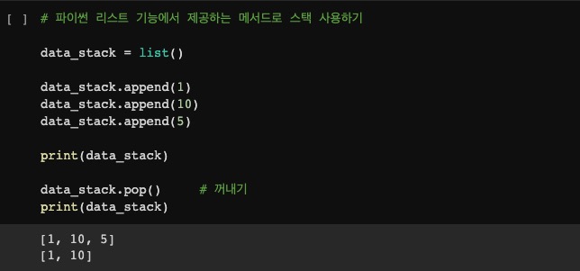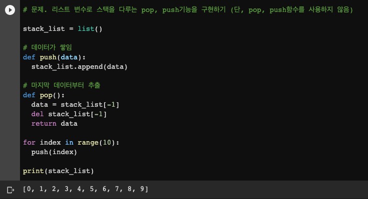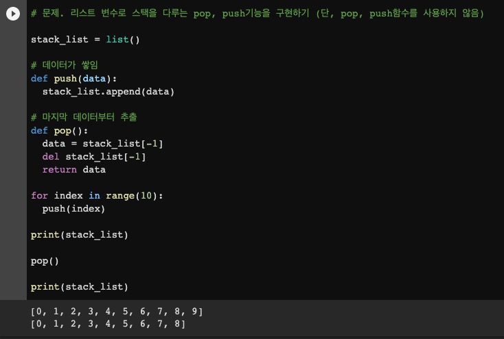 문제. 리스트 변수로 스택을 다루는 pop, push기능을 구현하기 (단, pop, push함수를 사용하지 않음)