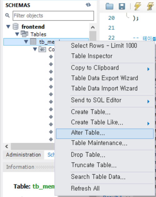 여기서 Tables를 마우스 오른쪽 버튼을 눌러서 Refresh All를 누르면 tb_mamber가 생긴다.