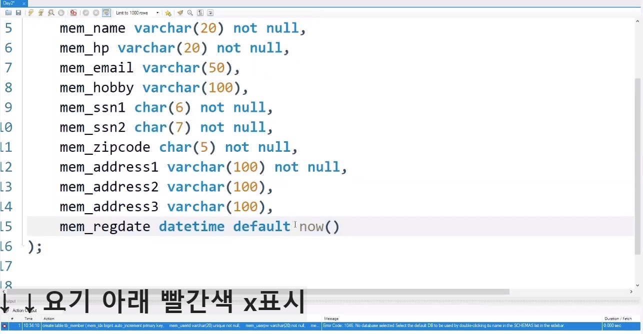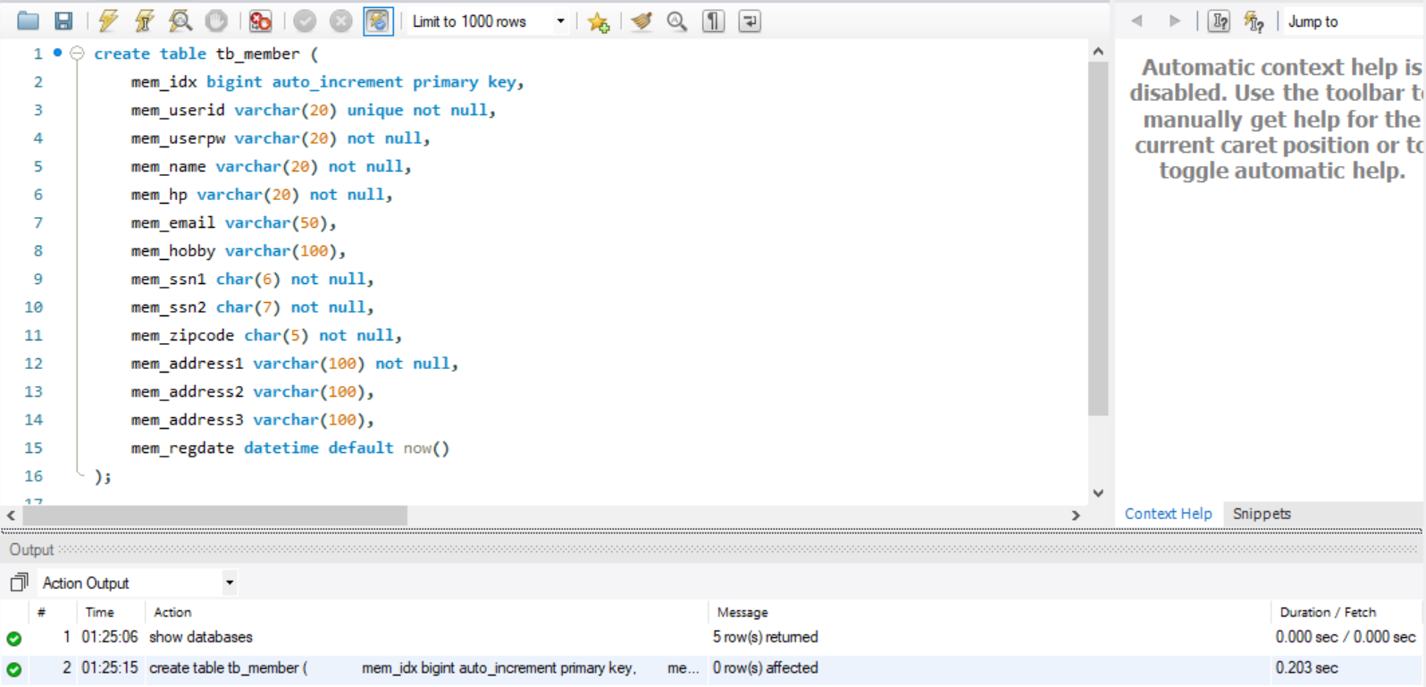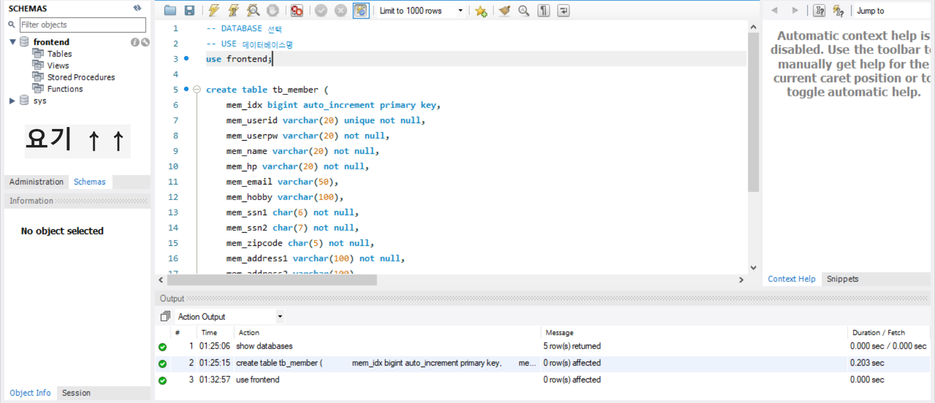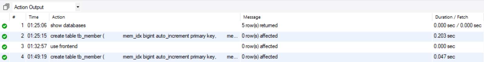 create table tb_member를 다시 실행하면 성공했다고 맨아래 초록색 메세지가 뜬다.