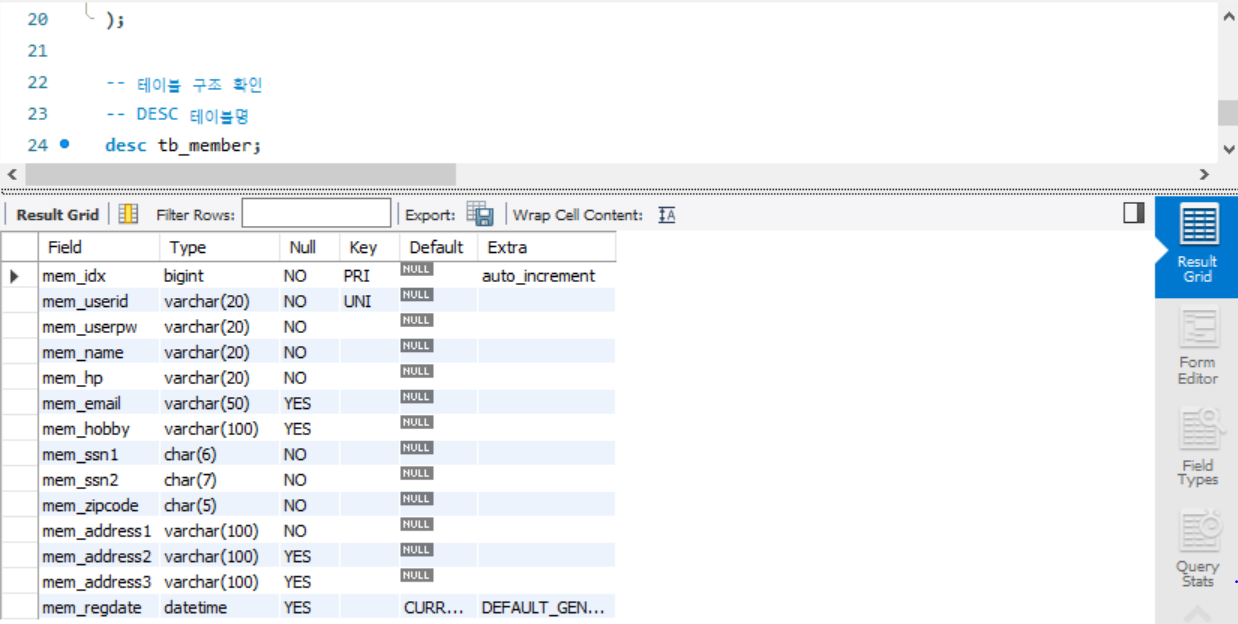 desc tb_member; 를 실행