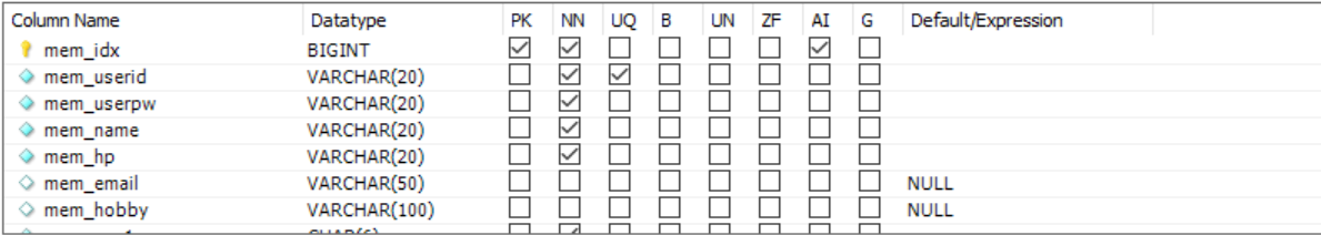 # 3번째 필드_mem_userpw, varchar(20) 20글자까지 허용, unique not nul를 걸면 비밀번호가 같을 수 있고, 비밀번호는 무조건 있어야 하니 not null조건 주기.
