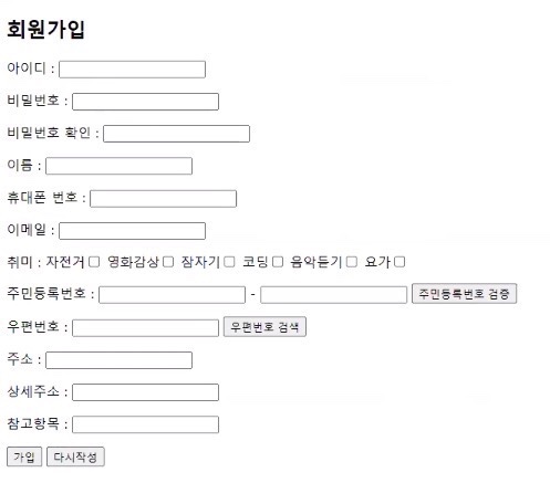 아이디, 비밀번호, 이름, 휴대폰 번호, 이메일, 취미, 주민번호(2칸인데 하나로 넣을지 두개로 나눌지 고민해보기), 우편번호, 상세주소, 참고항목.