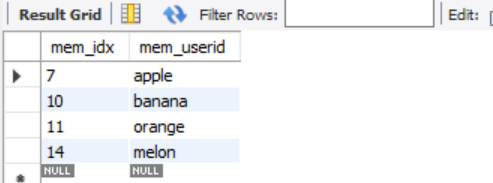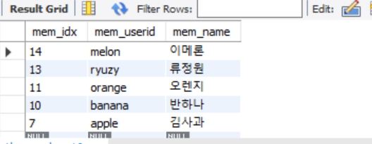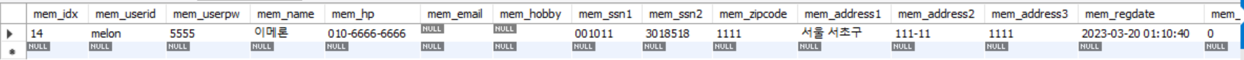 select * from tb_member where mem_userid = 'melon';이거를 이메일과 취미를 지워보고 select해보기