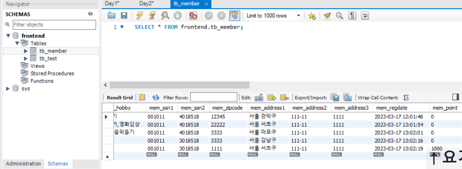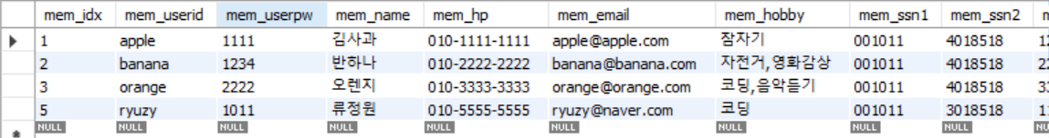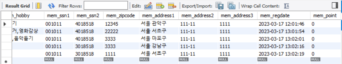 mem_hobby, mem_ssn1, mem_ssn2, mem_zipcode, mem_address1, mem_address2, mem_address3)