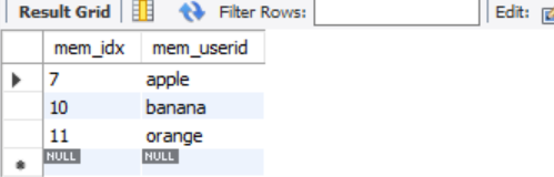 select mem_idx, mem_userid, mem_name from tb_member order by mem_idx asc;