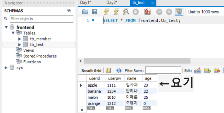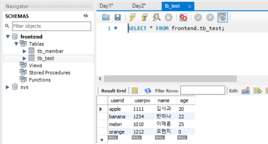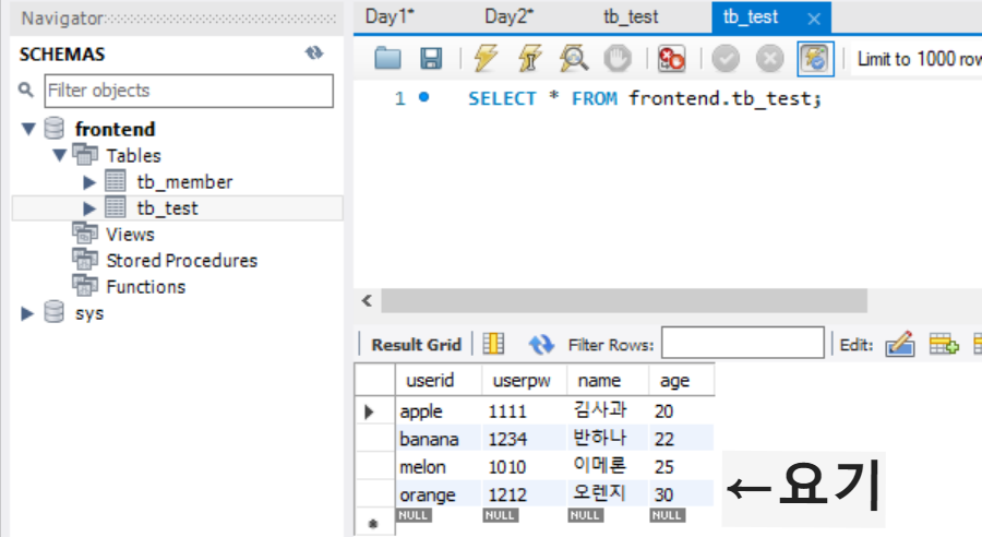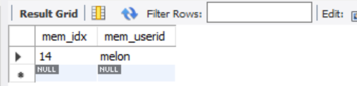 insert into tb_test (userid, userpw, name, age) VALUES ('melon', '1010', '이메론', 25); 실행