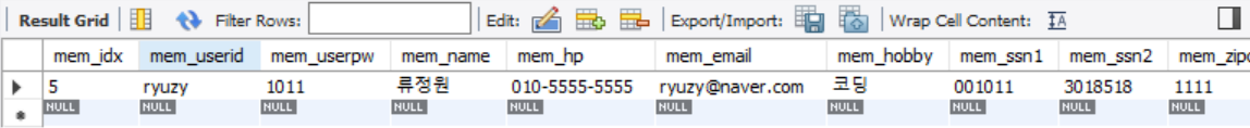 values('ryuzy', '1011', '류정원', '010-5555-5555', 'ryuzy@naver.com','코딩',