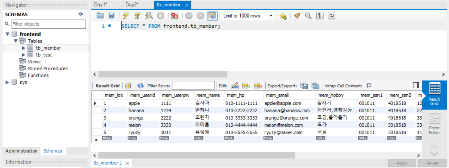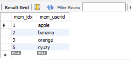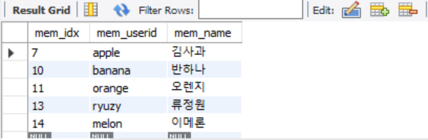 1. select mem_idx, mem_userid, mem_name from tb_member order by mem_idx;
