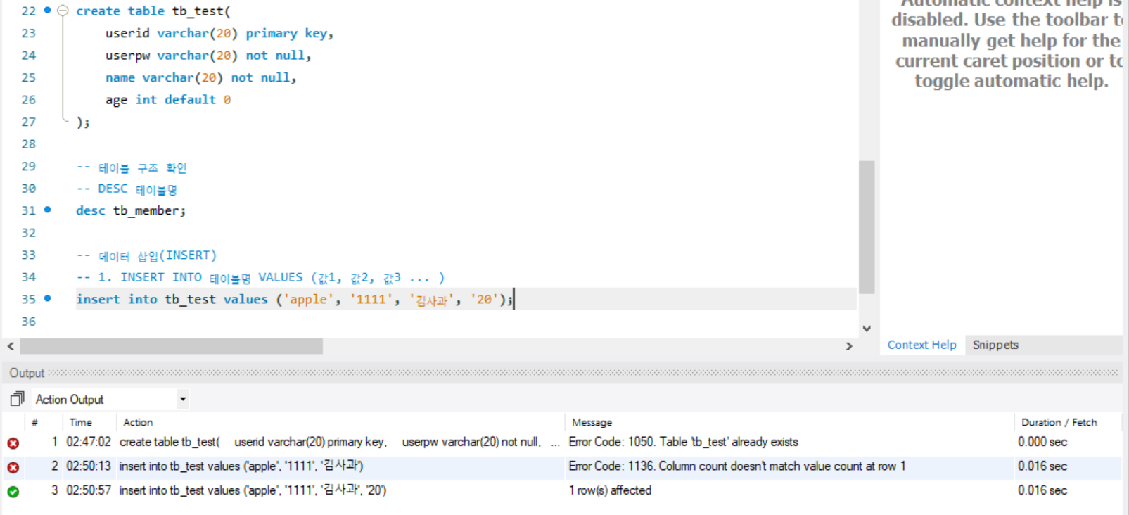 위에 만든 테이블 컬럼이 다 들어가야 에러가 안 뜸.