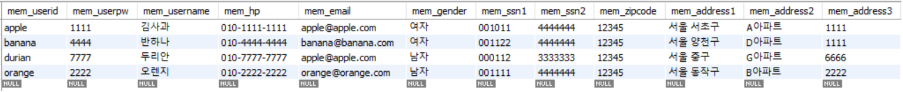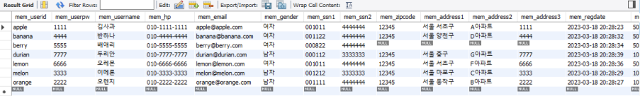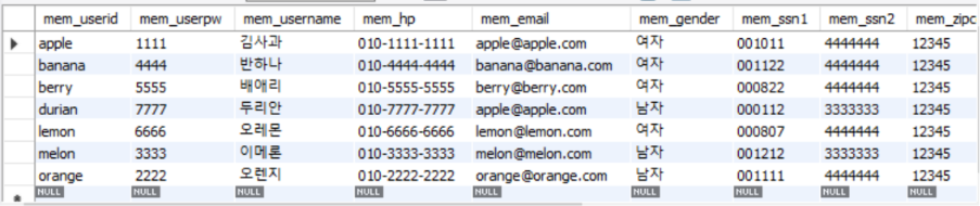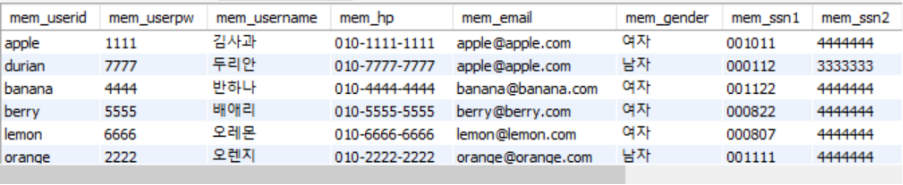 SELECT mem_userid, mem_userpw, mem_username, mem_hp, mem_email, mem_gender,