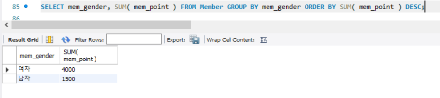 9. 남자와 여자로 그룹을 나눠 남자, 여자의 포인트 합계를 구하여 출력합니다.
