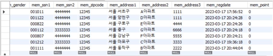 mem_ssn1, mem_ssn2, mem_zipcode, mem_address1, mem_address2, mem_address3 FROM Member